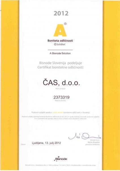 Čas - Zasebna šola za varnostno izobraževanje d.o.o. je 13. 7. 2012 prejela cetifikat, ki ga podeljuje Bisnode, družba za medije ter poslovne in bonitetne informacije, d.o.o.